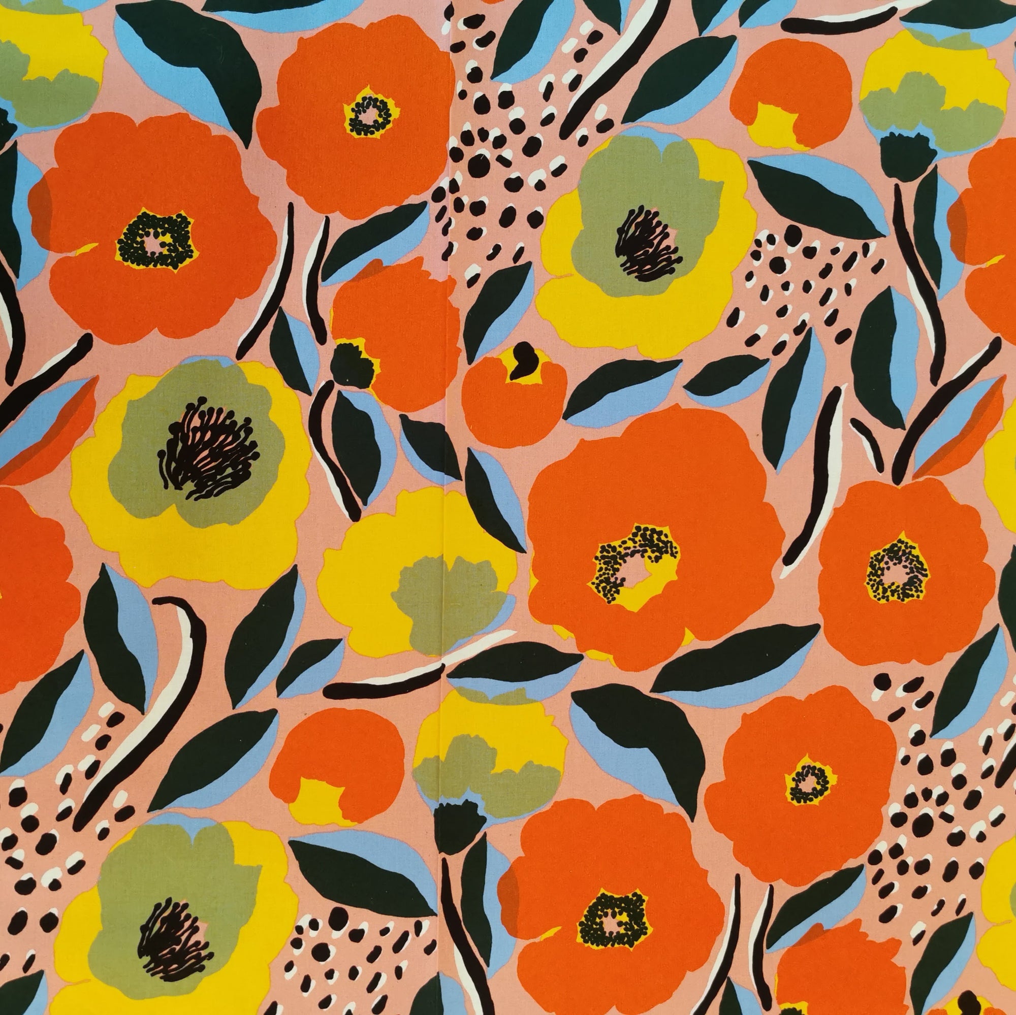 Beim Marimekko Design Rosarium ließ sich Aino-Maija Metsola von üppigen sommerlichen Rosengärten inspiriieren. Wie in der Fülle der spätsommerlichen Gärten entsteht entsteht eine bunte Farbpracht auf dem Stoff.