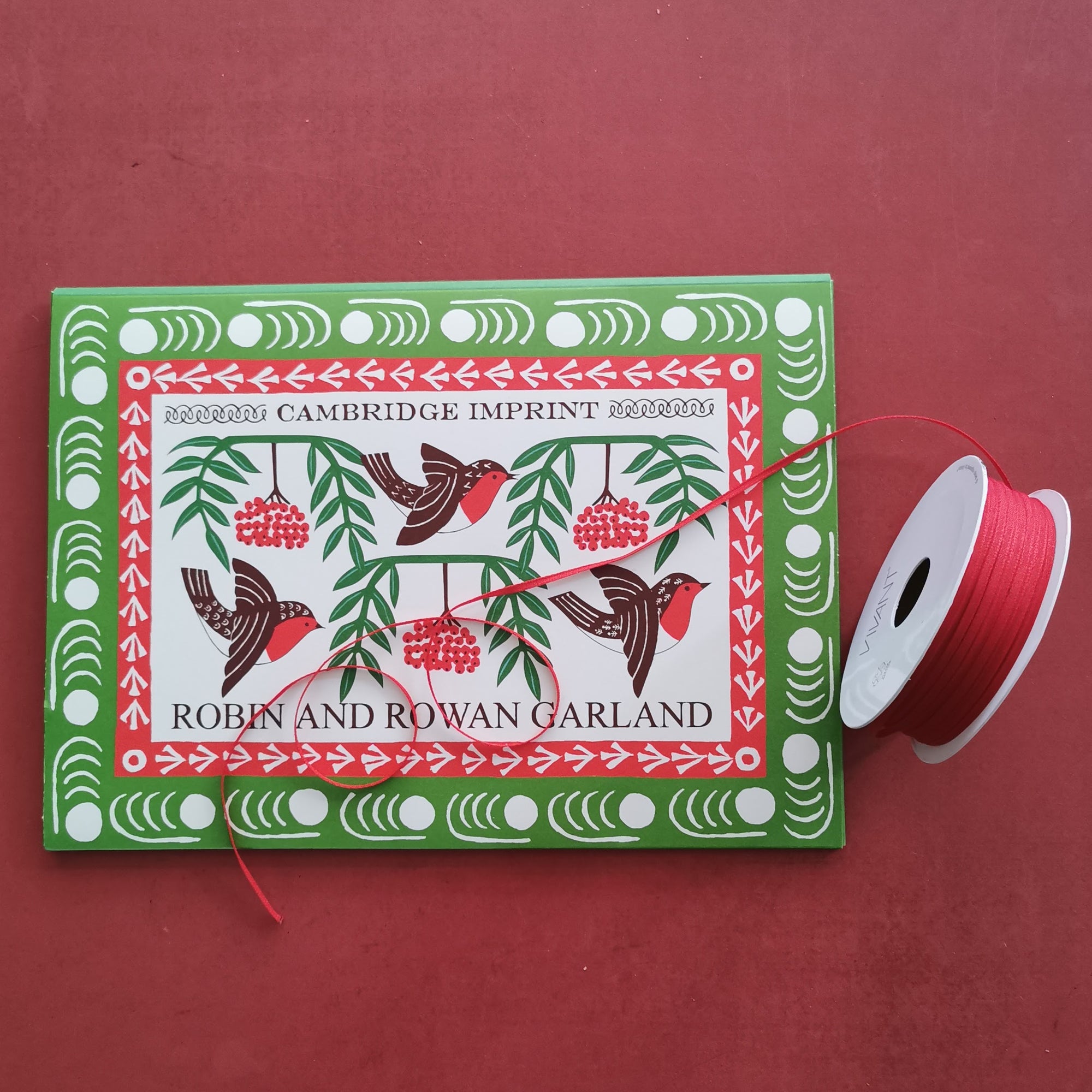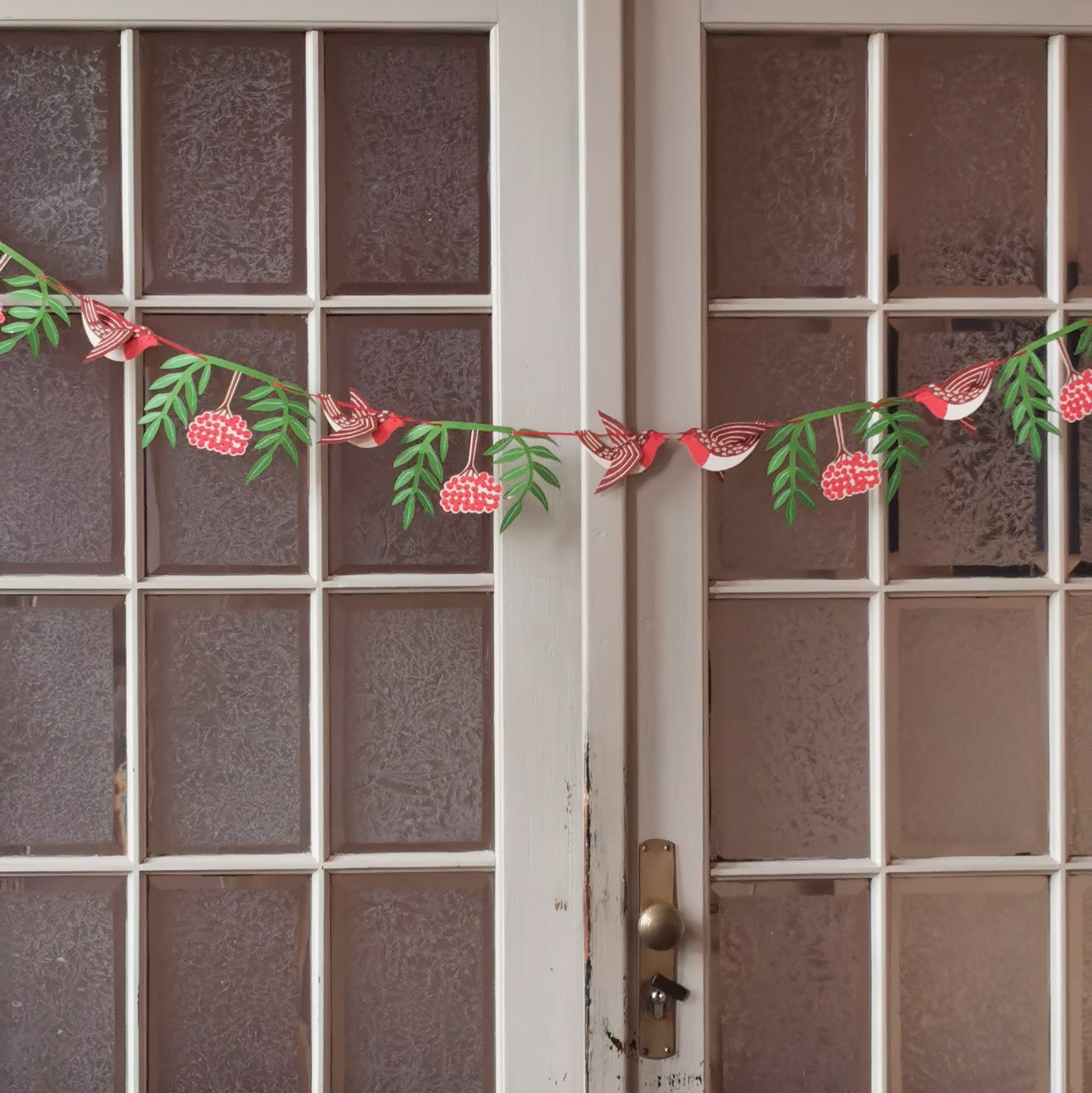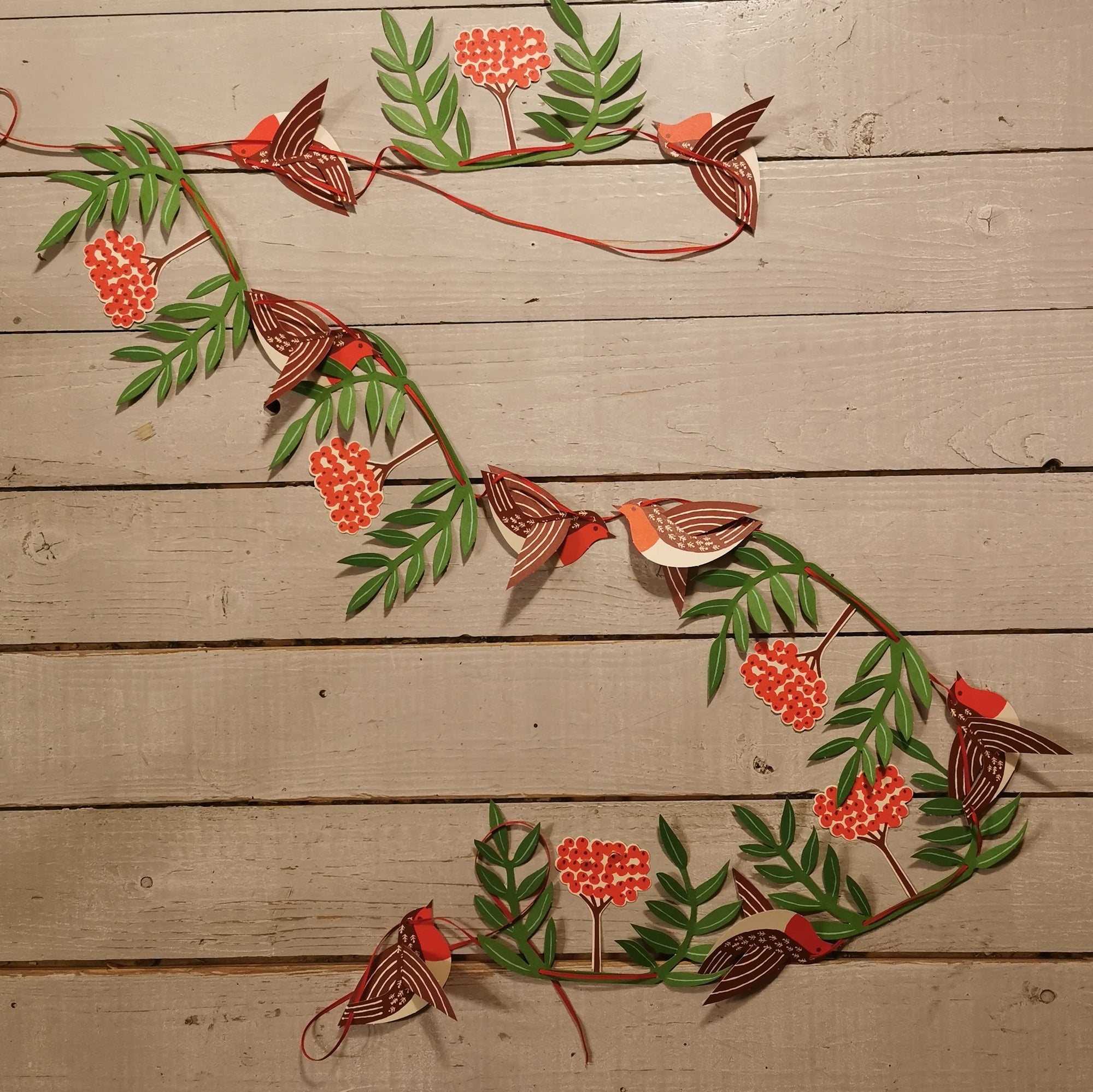 Die Rotkehlchen-Girlande mit Ebereschenzweigen ist in kräftigen Farben detailiert illustriert. Die Elemete lassen sich einfach aus dem vorgestanzeten Papier lösen und auffädeln und ergeben eine ca. 3 Meter lange Girlande.