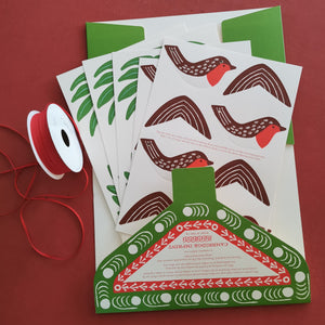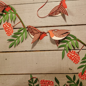 Diese Girlande umfasst Sechs Zweige mit Ebereschenblättern und -beeren und acht charmante Rotkehlchen in einer selbstschließenden Kartenhülle zur langfristigen Aufbewahrung.